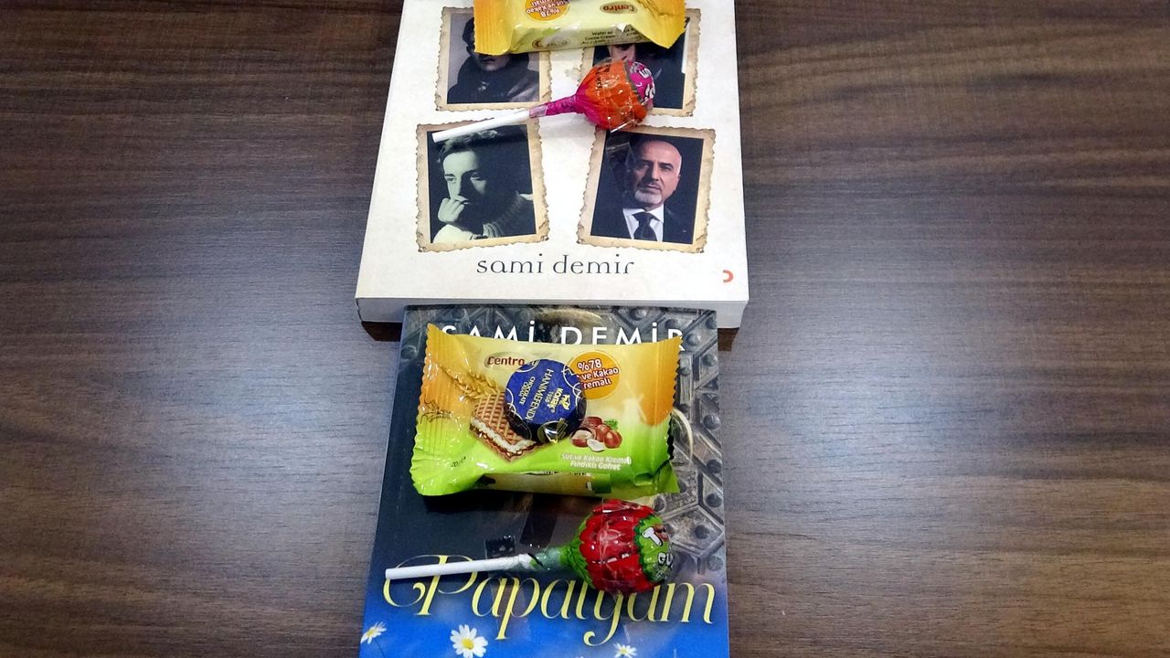 Barış KUL/ERCİŞ, (Van), (DHA)- VAN'ın Erciş ilçesinde yaşayan Sami Demir (66), Ramazan Bayramı'nda kapısını çalan çocuklara sürpriz yaptı. Demir, bayram şekeri yerine kendi yazdığı kitapların üzerine yapıştırdığı şeker ve çikolataları çocuklara dağıtarak, kitap okuma alışkanlığının da önemine dikkat çekti.