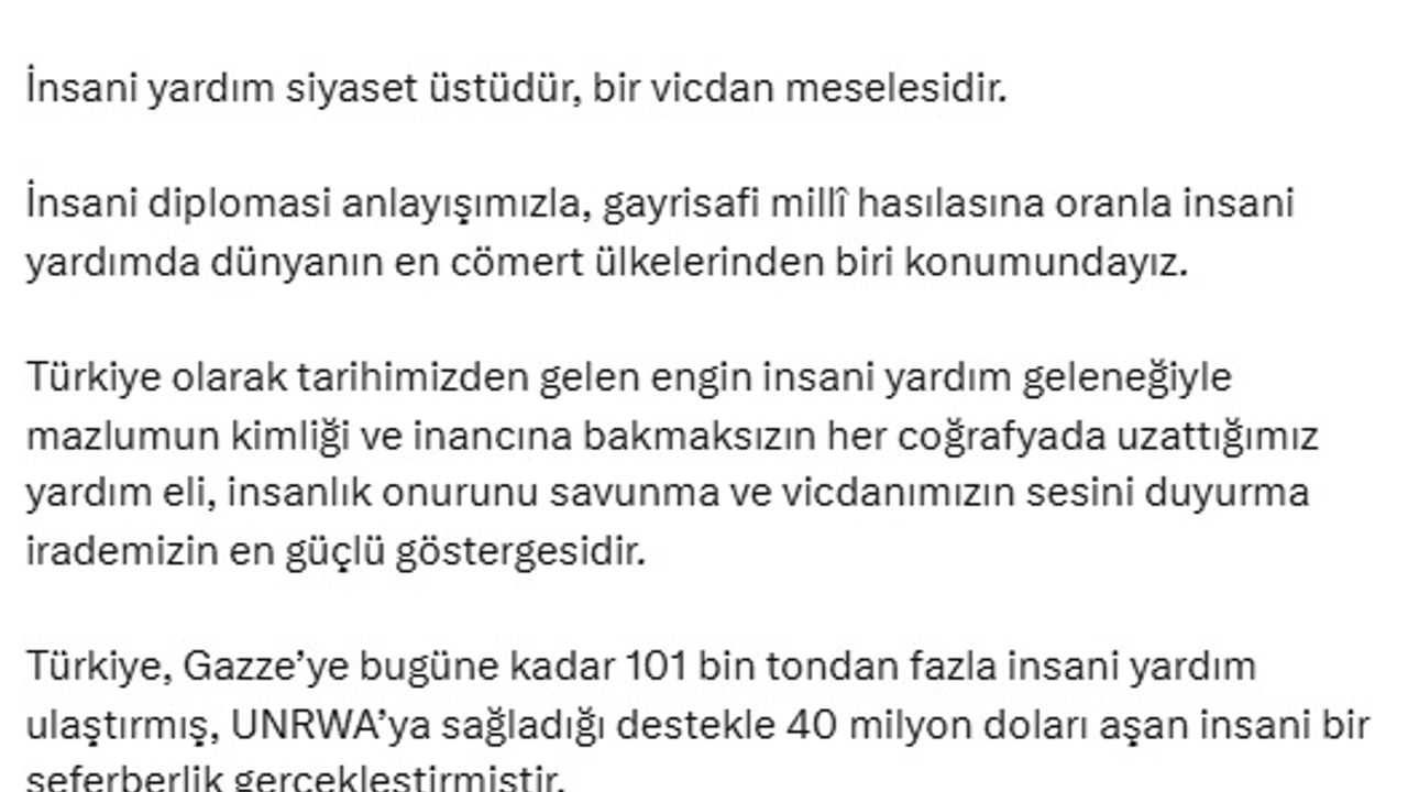 ANKARA, (DHA)- CUMHURBAŞKANI Recep Tayyip Erdoğan, "Dünya İnsani Yardım Günü’nde, karşımızda duran acı gerçek, 300 milyondan fazla insanın en temel insani ihtiyaçlarından yoksun olmasıdır. Bu tablo, insanlığın vicdanını sarsan, tüm dünyayı sorumluluğa çağıran bir hakikattir. İnsani yardım siyaset üstüdür, bir vicdan meselesidir" dedi.