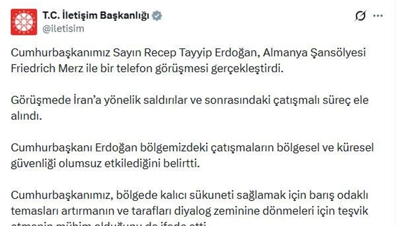 İletişim Başkanlığı'ndan yapılan açıklamada, 'Cumhurbaşkanımız Sayın Recep Tayyip Erdoğan, Almanya Şansölyesi Friedrich Merz ile bir telefon görüşmesi gerçekleştirdi. Görüşmede İran'a yönelik saldırılar ve sonrasındaki çatışmalı süreç ele alındı. Cumhurbaşkanı Erdoğan bölgemizdeki çatışmaların bölgesel ve küresel güvenliği olumsuz etkilediğini belirtti. Cumhurbaşkanımız, bölgede kalıcı sükuneti sağlamak için barış odaklı temasları artırmanın ve tarafları diyalog zeminine dönmeleri için teşvik etmenin mühim olduğunu da ifade etti' denildi. (DHA)