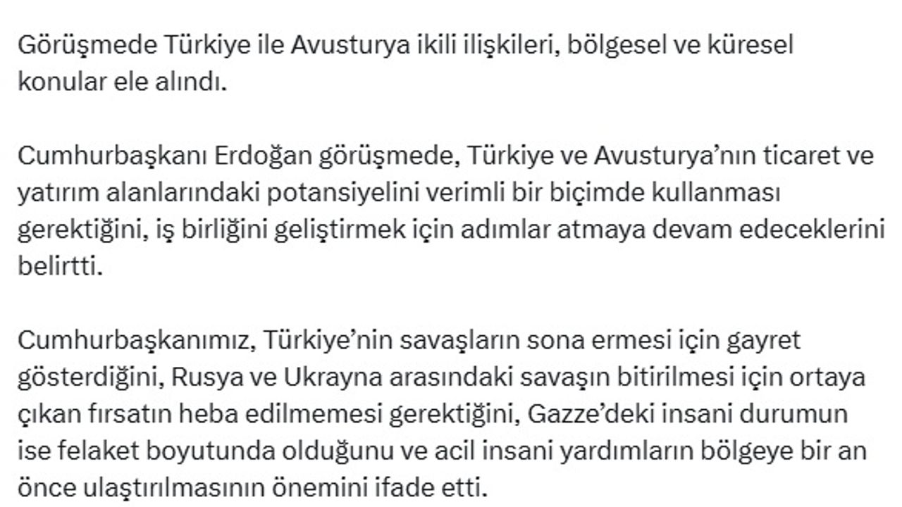 İletişim Başkanlığı'ndan yapılan açıklamaya göre, Cumhurbaşkanımız Recep Tayyip Erdoğan, Avusturya Başbakanı Christian Stocker ile bir telefon görüşmesi gerçekleştirdi. Görüşmede Türkiye ile Avusturya ikili ilişkileri, bölgesel ve küresel konular ele alındı. Cumhurbaşkanı Erdoğan görüşmede, Türkiye ve Avusturya’nın ticaret ve yatırım alanlarındaki potansiyelini verimli bir biçimde kullanması gerektiğini, iş birliğini geliştirmek için adımlar atmaya devam edeceklerini belirtti. Cumhurbaşkanı Erdoğan, Türkiye’nin savaşların sona ermesi için gayret gösterdiğini, Rusya ve Ukrayna arasındaki savaşın bitirilmesi için ortaya çıkan fırsatın heba edilmemesi gerektiğini, Gazze’deki insani durumun ise felaket boyutunda olduğunu ve acil insani yardımların bölgeye bir an önce ulaştırılmasının önemini ifade etti. Cumhurbaşkanı Erdoğan görüşmede, Türkiye’nin Suriye’de istikrarın daim kılınmasına yönelik çabalarını sürdürdüğünü, Suriyeli mültecilerin vatanlarına geri dönüşlerinin sağlanması için sosyal ve ekonomik refahın artırılmasının büyük önem taşıdığını belirtti. (DHA)