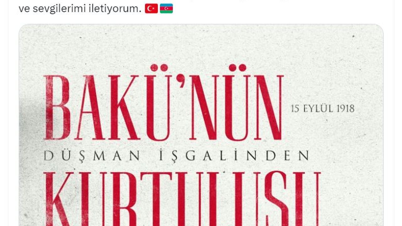 Cumhurbaşkanı Erdoğan, sosyal medya hesabından yayımladığı mesajda, "Can Azerbaycan'ın başkenti Bakü'nün düşman işgalinden kurtuluş yıl dönümünü en kalbi duygularımla tebrik ediyorum. Kafkas İslam Ordusu Komutanı Nuri Killigil Paşa'yı ve tüm kahramanlarımızı rahmetle yad ediyor, kardeş Azerbaycan halkına selam ve sevgilerimi iletiyorum" ifadelerini kullandı. (DHA)