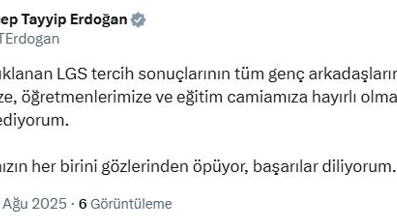 ANKARA, (DHA)- CUMHURBAŞKANI Recep Tayyip Erdoğan, Liselere Geçiş Sistemi (LGS) tercih sonuçlarının eğitim camiasına hayırlı olması temennisinde bulundu.