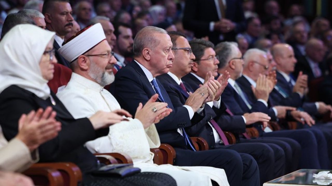 Erdoğan, “Peygamberimiz Aleyhiselatü Vesselam aynı zamanda maşukumuz, sultanımız, en sevgilimizdir. Peygamber aşkı aziz milletimizin yüreğinde adeta kök salmış yüce bir çınardır. Bu çınarın kolları Asya’dan Afrika’ya bütün cihanı sarmıştır. Biz işte bu yüzden dünyadaki bütün Müslümanlara derin bir muhabbet besleriz. İşte bu yüzden dünyanın neresinde bir Müslüman varsa gönlümüz, aklımız, ruhumuz oradadır. İşte bu yüzden tüm Müslümanları bir bedenin azaları olarak görür, bir tarağın dişleri, bir binanın tuğlaları olarak biliriz. Onun için biz şu anda Filistin’deyiz, onun için biz şu anda Gazze’deyiz, onun için biz şu anda Filistin’de olan bütün bu Netanyahu denilen gaddarın, kafirin, o kıyımına asla seyirci kalamayız. Şu anda bizleri ümmet şuuruyla kalplerimizi birleştiren, bizi birbirimize kenetleyen bu bağ Muhammedi bir Muhammed ve bir muhabbet bağıdır. Şu an kalbimizin yarısı buradaysa, diğer yarısı İslam dünyasının kanayan yaraları olan Gazze’de, Filistin’de, Yemen, Sudan, Afganistan’dadır. İnşallah bu gece yapacağımız dualarda nerede yaşarsa yaşasın mazlum ve mağdurları unutmayacağız. Ellerimizi semaya inşallah onlar için de açacağız. Seccadelerimizi gözyaşlarımızla onlar içinde ıslatacağız. Bölgemizde ve dünyada barışın, huzurun, güvenliğin hakim olması için alemlerin Rabbine niyazda bulunacağız” ifadelerini kullandı.