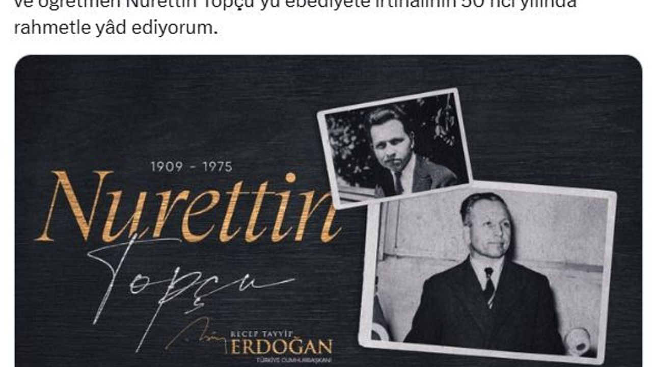 ANKARA, (DHA)- CUMHURBAŞKANI Recep Tayyip Erdoğan, sosyolog, yazar, öğretmen Nurettin Topçu'yu 50'nci ölüm yıl dönümünde andı.