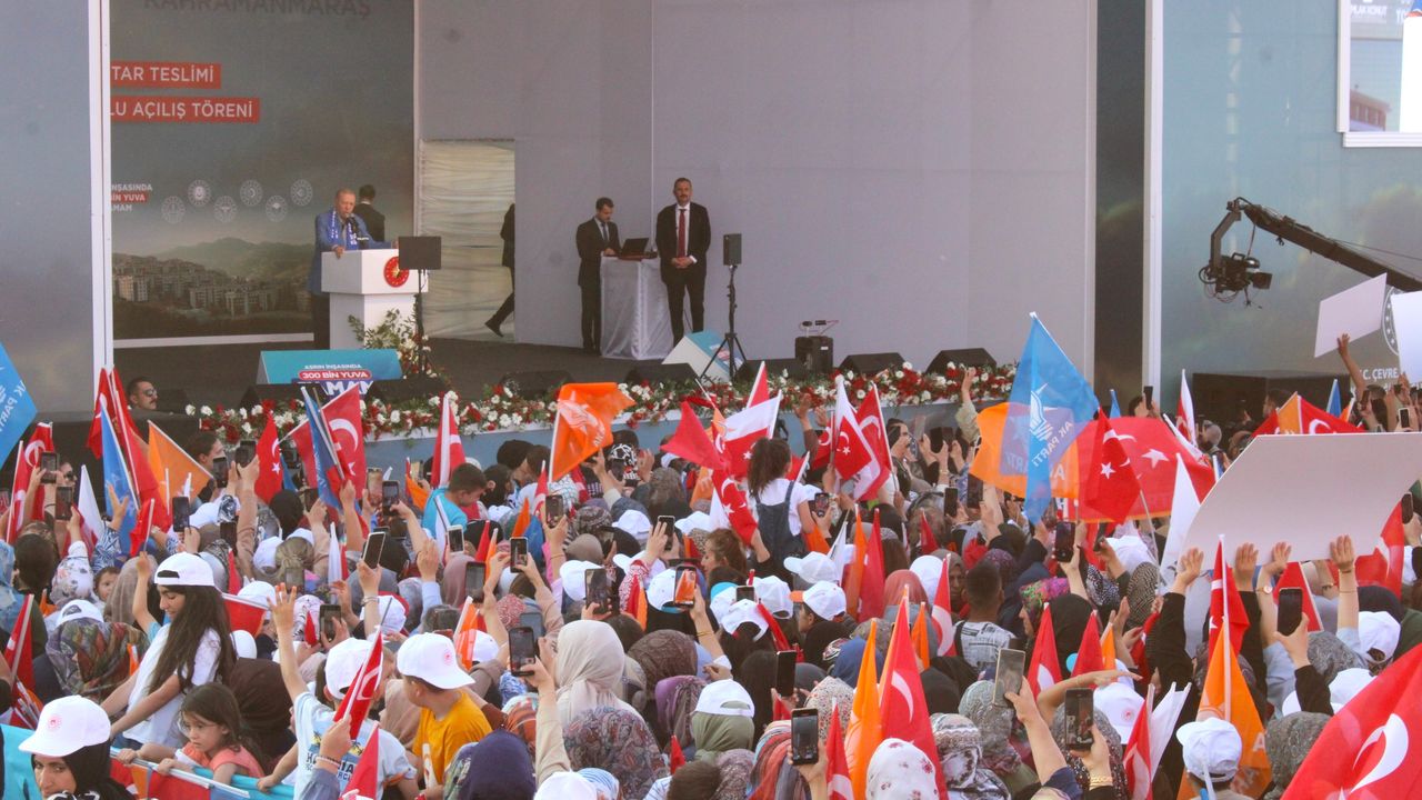 Valilik binasındaki temaslarının ardından Cumhurbaşkanı Erdoğan, Malatya Büyükşehir Belediyesi yanındaki alanda yapılan 300 bininci konut kura çekimi, anahtar teslimi ve yapımı tamamlanan eserlerin toplu açılış törenine katıldı. Cumhurbaşkanı Recep Tayyip Erdoğan, konuşmasına Dünya Şampiyonası'nda finale yükselen A Milli Kadın Voleybol takımı ile Euro Basket 2025'te çeyrek finale çıkan A Milli Erkek Basketbol Takımını kutlayıp, yarın İspanya ile karşılaşacak A Milli Futbol Takımına da başarılar diledi. Deprem felaketinin hemen ardından çalışmalara başladıklarını dile getiren Cumhurbaşkanı Erdoğan, “11 ilimizde inşası tamamlanan 300 bininci konutumuzun hamdolsun dağıtımını yapıyoruz. Bugün aynı zamanda yeni yatırımlarımızın resmi açılışlarını yapmanın heyecanını yaşıyoruz. Modern, güvenli ve estetik bir anlayışla inşa edilen yeni yuvalarımızın Malatya ve diğer illerimizdeki kardeşlerime hayırlı olmasını diliyorum. Hak sahibi her bir vatandaşımızın bu hanelerde gönül huzuruyla, ağız tadıyla sıhhat ve afiyet içinde oturmasını temenni ediyorum” diye konuştu.