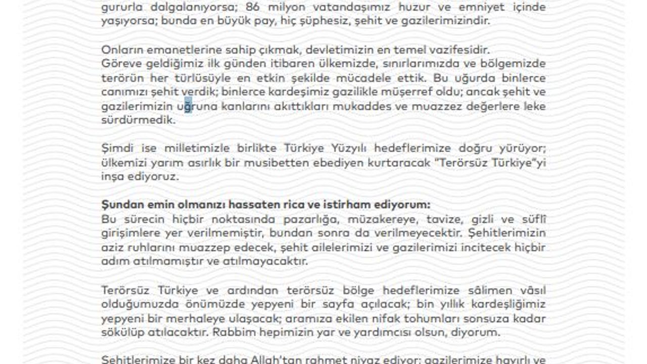 Aybala MELEK/ANKARA, (DHA)- CUMHURBAŞKANI Recep Tayyip Erdoğan, 'Terörsüz Türkiye'ye dair şehit ve gazi aileleri için kaleme aldığı mektupta, "Bu sürecin hiçbir noktasında pazarlığa, müzakereye, tavize, gizli ve süfli girişimlere yer verilmemiştir, bundan sonra da verilmeyecektir. Şehitlerimizin aziz ruhlarını muazzep edecek, şehit ailelerimizi ve gazilerimizi incitecek hiçbir adım atılmamıştır ve atılmayacaktır" dedi.
