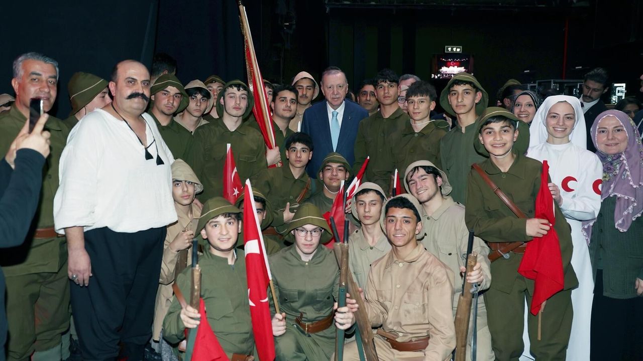 Milli Eğitim Bakanlığı'nın (MEB) 18 Mart Şehitleri Anma Günü ve Çanakkale Deniz Zaferi'nin 111'inci yıl dönümü etkinlikleri kapsamında hazırladığı, 'Şüheda 1915' adlı tiyatro oyunu, Cumhurbaşkanlığı Külliyesi Beştepe Millet Kongre ve Kültür Merkezi'nde Cumhurbaşkanı Erdoğan'ın katılımıyla gerçekleştirildi. Programa; Cumhurbaşkanı Erdoğan'ın yanı sıra Milli Eğitim Bakanı Yusuf Tekin ve çok sayıda davetli katıldı. Saygı duruşunda bulunulması ve İstiklal Marşı'nın okunmasının ardından tiyatro oyunu sergilendi. Oyunun ardından Çanakkale muharebelerinin tarihsel gerçekliğini yansıtan arşiv fotoğraflar, yapay zeka teknolojisiyle canlandırıldığı video izletildi. Videoda yer alan söz ve müzik, Prof. Dr. İbrahim Sarıtaş'a ait olan 'Dirilişin Destanı' şiirinden derlendi. Programın sonunda Bakan Tekin, Cumhurbaşkanı Erdoğan'a 'Yaşasın Askerler Tablosu'nu hediye etti. Davetlilere de Çanakkale cephesine uğurlanan ve tarihe 'Onbeşliler' olarak geçen genç askerlere, anneleri tarafından verilen mendil örnekleri hediye edildi. (DHA)