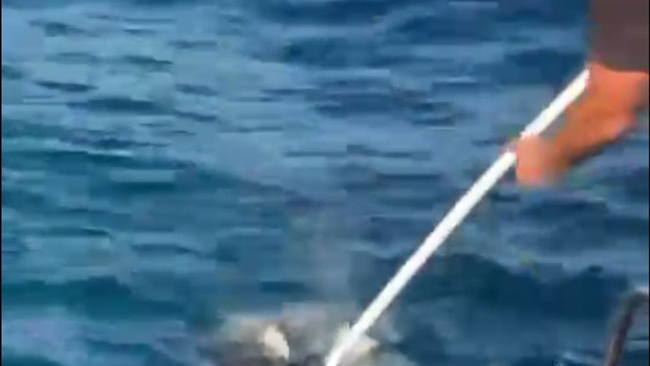 Okurcalar Mahallesi açıklarında sabah saatlerinde bir grup amatör balıkçı, su yüzeyinde plastik çuvala dolanmış yavru deniz kaplumbağası gördü. Balıkçılar, tekneye aldıkları kaplumbağanın dolandığı çuvalı makasla kesti, daha sonra yeniden denize bıraktı. Kaplumbağanın kurtarılma anları cep telefonuyla görüntülendi. (DHA)