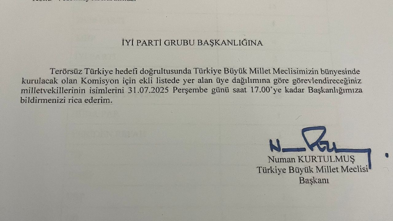 TBMM Başkanı Numan Kurtulmuş, 'Terörsüz Türkiye' süreci kapsamında Meclis'te kurulacak komisyon için partilere yazı gönderdi. Partilerden, 31 Temmuz saat 17.00'ye kadar komisyon için isim vermeleri istendi. İYİ Parti Genel Başkanı Müsavat Dervişoğlu, Meclis Başkanı Kurtulmuş'un gönderdiği yazıyı sosyal medya hesabından paylaşarak konuya ilişkin açıklamada bulundu. Dervişoğlu, "Meclis Başkanının çağrısı ile kurulacak olan komisyon, anayasa veya TBMM İçtüzüğü'nde açıkça tanımlanmış daimi veya geçici ihtisas komisyonlarından biri değildir. Meclis Başkanı’nın bu girişimi tıpkı geçmişteki anayasa veya içtüzük uzlaşma komisyonlarında olduğu gibi siyasi partilerin temsil edilmesini sağlayan gayriresmi ve siyasi inisiyatife dayalı bir düzenleme niteliğindedir. Diğer taraftan; İçtüzük, bir komisyonun çalışma usul ve esaslarına açıkça yer vermektedir. Komisyonların kuruluş sürecinde amaç, kapsam, hedef, dayanak ve süre net bir şekilde gerekçelendirilmektedir" dedi.