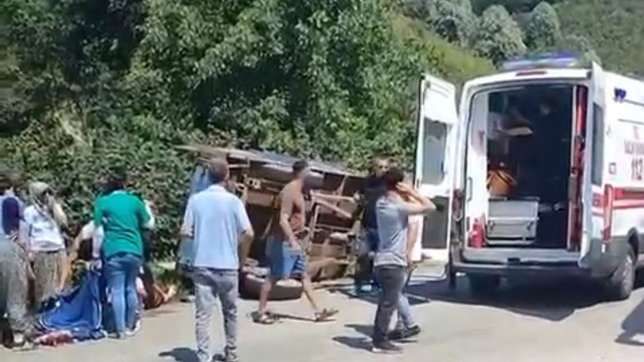 Musa KESKİN/ DÜZCE, (DHA)- DÜZCE’de, fındık işçilerinin taşındığı römorkun devrilmesi sonucu 7 kişi yola savrularak yaralandı.