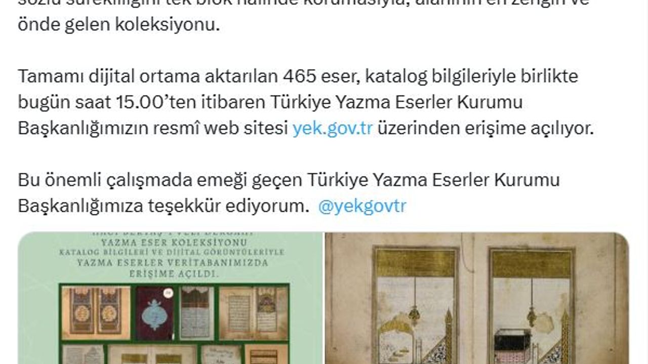 Kültür ve Turizm Bakanı Mehmet Nuri Ersoy, sosyal medya hesabından yaptığı açıklamada, "Anadolu'nun kültürel ve manevi hayatında evrensel bir bilgelik sembolü olan Hacı Bektaş-ı Veli'nin mirasını, dijital ortamda dünyanın her köşesindeki meraklılarının ve gelecek nesillerin istifadesine sunuyoruz. Hacı Bektaş-ı Veli Dergahı Yazma Eser Koleksiyonu, Alevi-Bektaşi tarihinin en temel kaynaklarını bir araya getiriyor. Seçki; temel kaynak olmaları, tarihilik vasıfları, yazma eser çeşitliliği, hafızanın yazılı ve sözlü sözlü sürekliliğini tek blok halinde korumasıyla, alanının en zengin ve önde gelen koleksiyonu. Tamamı dijital ortama aktarılan 465 eser, katalog bilgileriyle birlikte bugün saat 15.00'ten itibaren Türkiye Yazma Eserler Kurumu Başkanlığımızın resmi web sitesi 'http://yek.gov.tr' üzerinden erişime açılıyor. Bu önemli çalışmada emeği geçen Türkiye Yazma Eserler Kurumu Başkanlığımıza teşekkür ediyorum" dedi. (DHA)