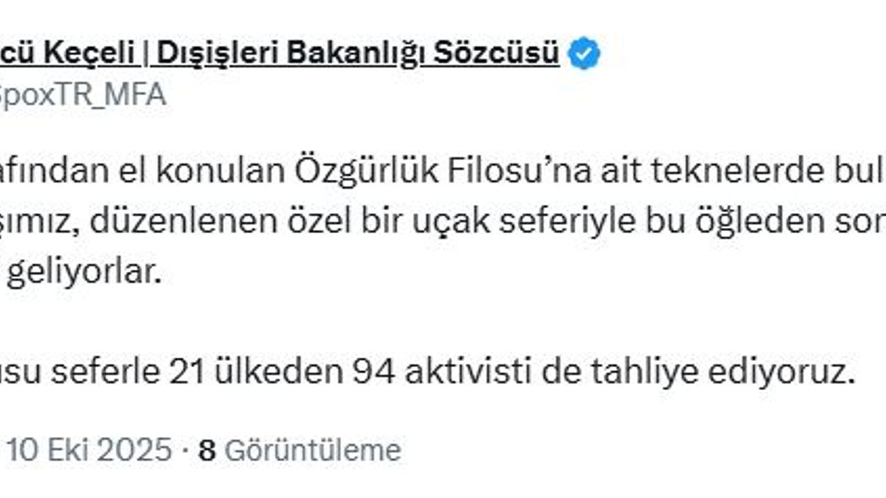 Dışişleri Sözcüsü Keçeli, sosyal medya hesabından yaptığı açıklamada, "İsrail tarafından el konulan Özgürlük Filosu'na ait teknelerde bulunan 18 vatandaşımız, düzenlenen özel bir uçak seferiyle bu öğleden sonra ülkemize geliyorlar. Söz konusu seferle 21 ülkeden 94 aktivisti de tahliye ediyoruz" ifadelerini kullandı. (DHA)