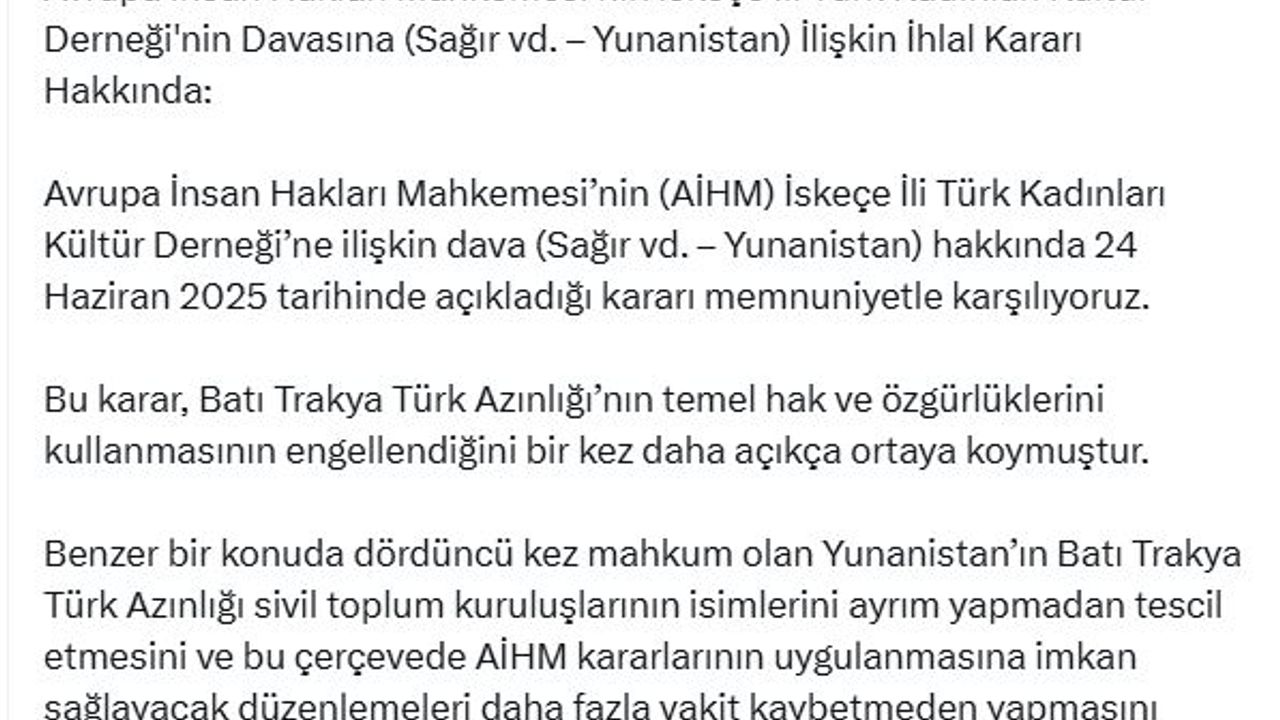 Dışişleri Bakanlığı Sözcüsü Öncü Keçeli, sosyal medya hesabından yaptığı açıklamada, "Avrupa İnsan Hakları Mahkemesi'nin İskeçe ili Türk Kadınları Kültür Derneği'ne ilişkin dava hakkında 24 Haziran 2025 tarihinde açıkladığı kararı memnuniyetle karşılıyoruz. Bu karar, Batı Trakya Türk azınlığının temel hak ve özgürlüklerini kullanmasının engellendiğini bir kez daha açıkça ortaya koymuştur. Benzer bir konuda dördüncü kez mahkum olan Yunanistan'ın, Batı Trakya Türk azınlığı sivil toplum kuruluşlarının isimlerini ayrım yapmadan tescil etmesini ve bu çerçevede AİHM kararlarının uygulanmasına imkan sağlayacak düzenlemeleri daha fazla vakit kaybetmeden yapmasını bekliyoruz" ifadelerini kullandı. (DHA)