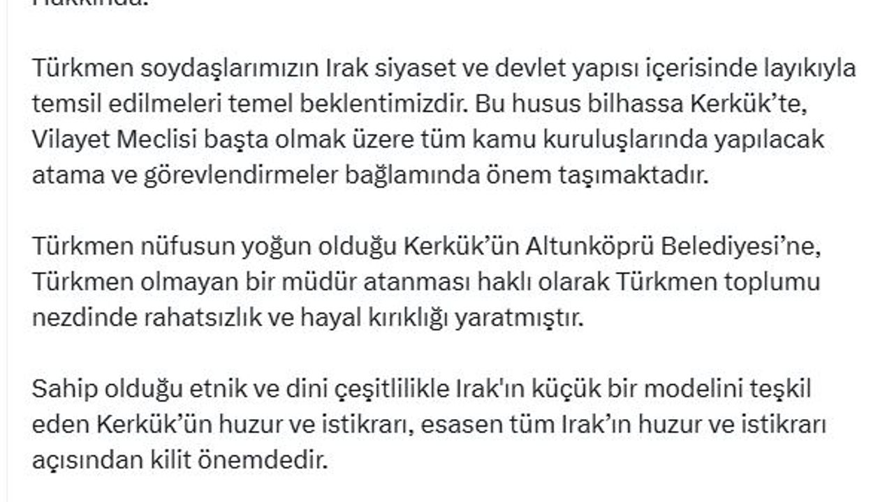 Dışişleri Sözcüsü Keçeli, sosyal medya hesabından yaptığı açıklamada, "Türkmen soydaşlarımızın Irak siyaset ve devlet yapısı içerisinde layıkıyla temsil edilmeleri temel beklentimizdir. Bu husus bilhassa Kerkük'te, Vilayet Meclisi başta olmak üzere tüm kamu kuruluşlarında yapılacak atama ve görevlendirmeler bağlamında önem taşımaktadır. Türkmen nüfusun yoğun olduğu Kerkük'ün Altunköprü Belediyesi'ne, Türkmen olmayan bir müdür atanması haklı olarak Türkmen toplumu nezdinde rahatsızlık ve hayal kırıklığı yaratmıştır. Sahip olduğu etnik ve dini çeşitlilikle Irak'ın küçük bir modelini teşkil eden Kerkük'ün huzur ve istikrarı, esasen tüm Irak'ın huzur ve istikrarı açısından kilit önemdedir. Bu bağlamda, Kerkük'teki gelişmeler ülkemiz tarafından yakından ve hassasiyetle takip edilmektedir" dedi. (DHA)
