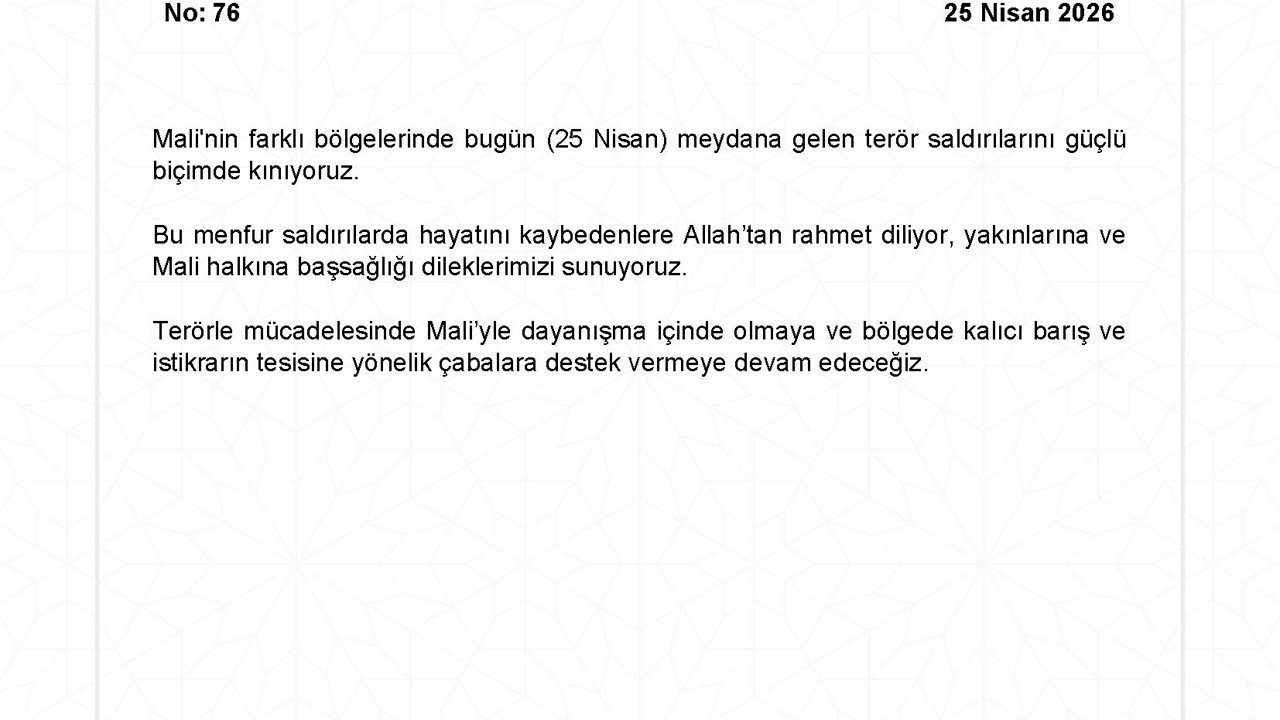 Dışişleri Bakanlığı'ndan yapılan açıklamada, 'Mali'nin farklı bölgelerinde bugün meydana gelen terör saldırılarını güçlü biçimde kınıyoruz. Bu menfur saldırılarda hayatını kaybedenlere Allah'tan rahmet diliyor, yakınlarına ve Mali halkına başsağlığı dileklerimizi sunuyoruz. Terörle mücadelesinde Mali'yle dayanışma içinde olmaya ve bölgede kalıcı barış ve istikrarın tesisine yönelik çabalara destek vermeye devam edeceğiz' ifadeleri kullanıldı. (DHA)