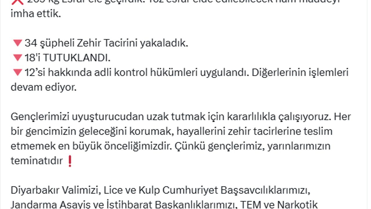 ANKARA, (DHA)- İÇİŞLERİ Bakanı Ali Yerlikaya, Diyarbakır'ın Lice ve Kulp ilçelerinde 269 kilogram esrar ele geçirilirken, toz esrar ham maddesinin imha edildiğini, gözaltına alınan 34 şüpheliden 18'inin tutuklandığını açıkladı.