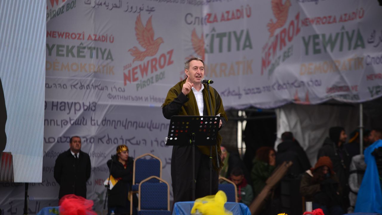 Bazı müzik gruplarının seslendirdiği şarkıların ardından terör örgütü PKK elebaşı Abdullah Öcalan'ın mesajı okundu. Ardından DEM Parti Eş Genel Başkanı Tuncer Bakırhan burada yaptığı konuşmada, 'Hepiniz görüyorsunuz Orta Doğu'da her sınır bir yara. Her başkent bir yangın yeridir neredeyse. Bu yangının tam ortasında Kürtler ve Kürt coğrafyası var. Bu tablo içinde Kürtler hem kendi güvenliklerini sağlamaya çalışıyor hem de bölgenin istikrarına katkı sunmaya çalışıyor. Bugün özellikle Ankara'nın önünde tarihi bir fırsat var. Kürt meselesini çözen bir Türkiye bölgede güçlü bir aktör olur. Gelin geleceğimizi kaybetmeyelim. Geleceği kazanmak için demokratik bir zemini hep birlikte büyütelim. Geçmişin yaraları geleceğimizi daha fazla kanatmasın. Bu ülke 100 yıldır defalarca kanadı. Artık bu kanamayı durduralım. Hani hep soruyorlar ya 'Kürtler ne istiyor' diye. Kürtler Türkiye'de kimliğinin tanınmasını istiyor. Kürtler ana dilinde eğitim istiyor. Kürtler anayasal güvence istiyor. Kürtler yerel demokrasi istiyor. Kürtler eşit yurttaşlık istiyor. Kürtlerin talebi ayrılık değil, ortaklıktır, inkar değil, tanınmadır, lütuf değil, haktır. Kürtler yönetime ortak olmak istiyor. Kürtler artık devletle münazara değil müzakere yapmak istiyor. Şimdi sıra barış yasalarında, şimdi sıra hukuki güvencede, şimdi sıra devlette ve iktidardadır. Artık sözden yasaya, temenniden güvenceye, vaatten eyleme geçme zamanıdır. Cezaevindekiler artık özgür olmalıdır. Figenler, Selahattinler, Leylalar, Ayşeler ve binlerce tutsak özgür olmalı. Dağdakiler demokratik siyasete katılabilmeli. Sürgündekiler evlerine dönebilmelidir. Demokratik siyasete katılabilmelidir. Halkın iradesini gasbeden kayyımlar artık gitmelidir. Öcalan'ın statüsü ve çalışma koşulları yasal düzenleme ile teminat altına alınmalıdır. Öcalan'ın bu meydanda halkıyla buluşmasının önü artık açılmalıdır' dedi.