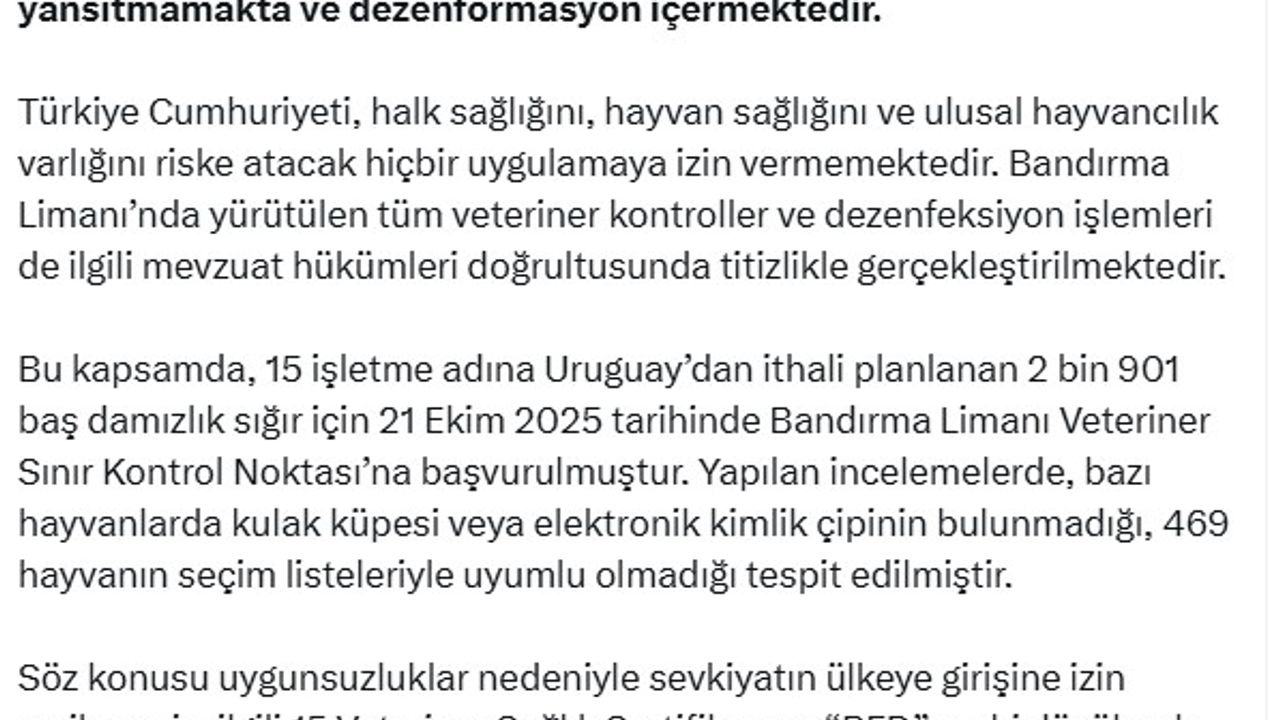 Bu kapsamda, 15 işletme adına Uruguay'dan ithali planlanan 2 bin 901 baş damızlık sığır için 21 Ekim'de Bandırma Limanı Veteriner Sınır Kontrol Noktası’na başvuru yapıldığı kaydedilerek, "Yapılan incelemelerde, bazı hayvanlarda kulak küpesi veya elektronik kimlik çipinin bulunmadığı, 469 hayvanın seçim listeleriyle uyumlu olmadığı tespit edilmiştir. Söz konusu uygunsuzluklar nedeniyle sevkiyatın ülkeye girişine izin verilmemiş; ilgili 15 Veteriner Sağlık Sertifikasına 'red' şerhi düşülerek karar 23 Ekim 2025 tarihinde Gümrük Müdürlüğü’ne bildirilmiştir. Buna karşılık firmalar, alınan karara itiraz ederek yargı süreci başlatmış; bu süreçte gemiyi Bandırma açıklarında bekletmişlerdir. Kamuoyunun doğru bilgilendirilmesi adına, manipülatif amaçlarla servis edilen asılsız iddialara itibar edilmemesi önemle duyurulur" ifadelerine yer verildi. (DHA)