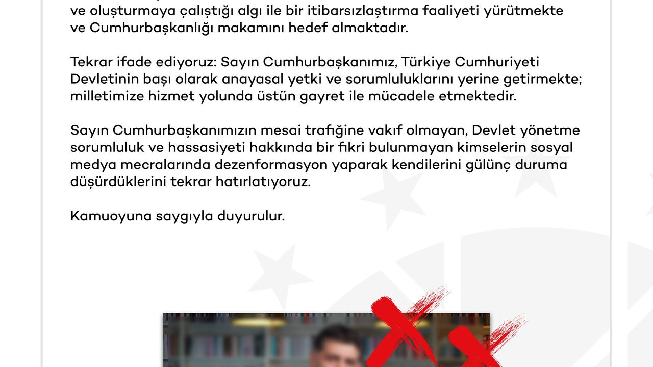 DMM'nin sosyal medya hesabından yapılan açıklamada, "Cumhurbaşkanımız Sayın Recep Tayyip Erdoğan, kendi takdirleri doğrultusunda irticalen veya not kullanarak hitaplarda bulunmaktadır. Hitaplarında yararlandığı notlar, bizzat direktifleri doğrultusunda hazırlanmakta ve talimatları doğrultusunda revize edilebilmektedir. Bir YouTube kanalında yayın yapan ve Sayın Cumhurbaşkanımızın sağlık durumuna ilişkin ısrarla mesnetsiz iddialarda bulunanlar, kullandıkları ifade ve oluşturmaya çalıştığı algı ile bir itibarsızlaştırma faaliyeti yürütmekte ve Cumhurbaşkanlığı makamını hedef almaktadır. Tekrar ifade ediyoruz; Sayın Cumhurbaşkanımız, Türkiye Cumhuriyeti devletinin başı olarak anayasal yetki ve sorumluluklarını yerine getirmekte, milletimize hizmet yolunda üstün gayret ile mücadele etmektedir. Sayın Cumhurbaşkanımızın mesai trafiğine vakıf olmayan, devlet yönetme sorumluluk ve hassasiyeti hakkında bir fikri bulunmayan kimselerin sosyal medya mecralarında dezenformasyon yaparak kendilerini gülünç duruma düşürdüklerini tekrar hatırlatıyoruz" ifadelerine yer verildi. (DHA)