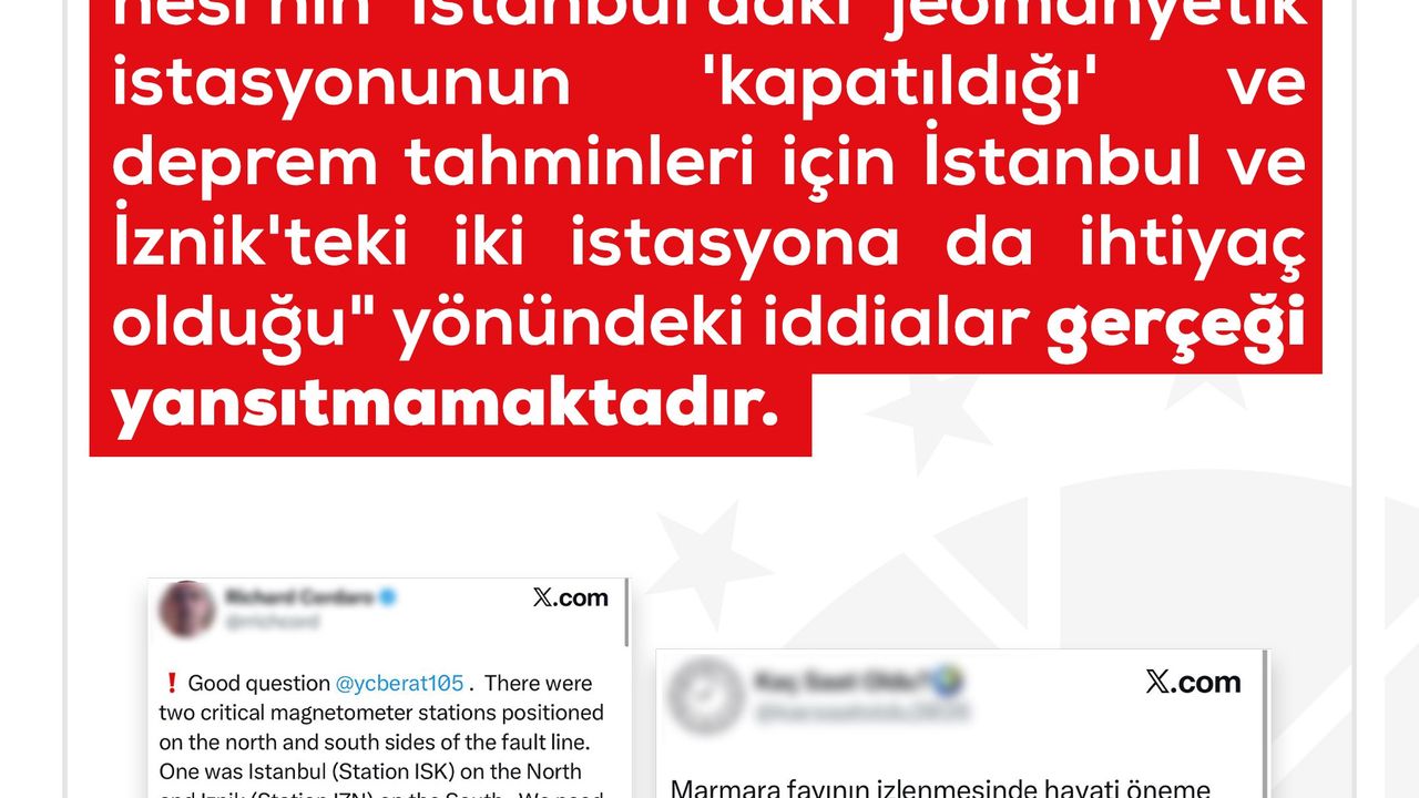 DMM'den yapılan açıklamada, 'Bazı sosyal medya paylaşımlarında yer alan, 'Kandilli Rasathanesi'nin İstanbul'daki jeomanyetik istasyonunun 'kapatıldığı' ve deprem tahminleri için İstanbul ve İznik'teki iki istasyona da ihtiyaç olduğu' yönündeki iddialar gerçeği yansıtmamaktadır. Bahse konu işlem bir kapatma değil; İstanbul'da artan manyetik gürültü ve kirlilik nedeniyle uluslararası ölçüm standartlarının korunması için ölçümlerin daha izole bir alan olan İznik İstasyonu'na aktarılmasından ibaret teknik bir modernizasyon ve yer değişikliğidir. Jeomanyetik veri akışında hiçbir zaman kesinti olmamıştır. Yalnızca geçiş sürecinde İstanbul-Kandilli (ISK) ve İznik (IZN) istasyonları bir süre eş zamanlı çalıştırılmıştır. Ayrıca jeomanyetik veriler, tek başına deprem yerini, zamanını ve büyüklüğünü önceden belirlemeye yeterli değildir. Bu yöndeki iddiaların bilimsel bir dayanağı bulunmamaktadır. Kamuoyunun; spekülasyon içeren, korku ve panik oluşturma amacı güden paylaşımlara itibar etmemesi rica olunur' ifadelerine yer verdi. (DHA)