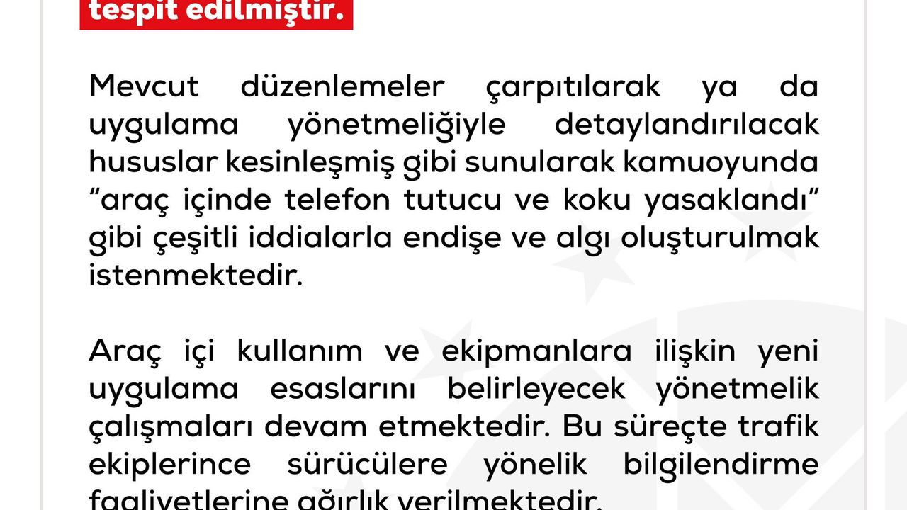 DMM'nin sanal medya hesabından yapılan açıklamada, 'Son günlerde Trafik Kanunu'nda yapılan değişiklikler üzerinden sosyal medyada çok sayıda yanıltıcı içeriğin dolaşıma sokulduğu tespit edilmiştir. Mevcut düzenlemeler çarpıtılarak ya da uygulama yönetmeliğiyle detaylandırılacak hususlar kesinleşmiş gibi sunularak kamuoyunda 'araç içinde telefon tutucu ve koku yasaklandı' gibi çeşitli iddialarla endişe ve algı oluşturulmak istenmektedir. Araç içi kullanım ve ekipmanlara ilişkin yeni uygulama esaslarını belirleyecek yönetmelik çalışmaları devam etmektedir. Bu süreçte trafik ekiplerince sürücülere yönelik bilgilendirme faaliyetlerine ağırlık verilmektedir. Vatandaşlarımızın spekülasyon içeren paylaşımlara itibar etmemesi, yalnızca yetkili merciler tarafından yapılan açıklamaları dikkate alması önemle rica olunur' ifadelerine yer verildi. (DHA)