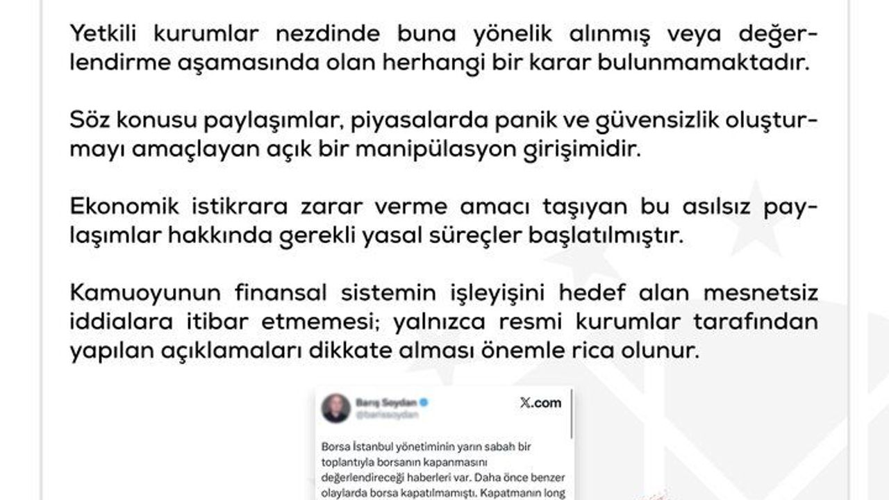 DMM'nin sanal medya hesabından yapılan açıklamada, 'Bazı sosyal medya hesaplarında, 'Borsa İstanbul'un pazartesi günü işlemlere kapatılmasının değerlendirildiği ya da bu yönde bir karar alınacağına ilişkin iddialar' dolaşıma sokulmaktadır. Yetkili kurumlar nezdinde buna yönelik alınmış veya değerlendirme aşamasında olan herhangi bir karar bulunmamaktadır. Söz konusu paylaşımlar, piyasalarda panik ve güvensizlik oluşturmayı amaçlayan açık bir manipülasyon girişimidir. Ekonomik istikrara zarar verme amacı taşıyan bu asılsız paylaşımlar hakkında gerekli yasal süreçler başlatılmıştır. Kamuoyunun finansal sistemin işleyişini hedef alan mesnetsiz iddialara itibar etmemesi; yalnızca resmi kurumlar tarafından yapılan açıklamaları dikkate alması önemle rica olunur' ifadelerine yer verildi. (DHA)