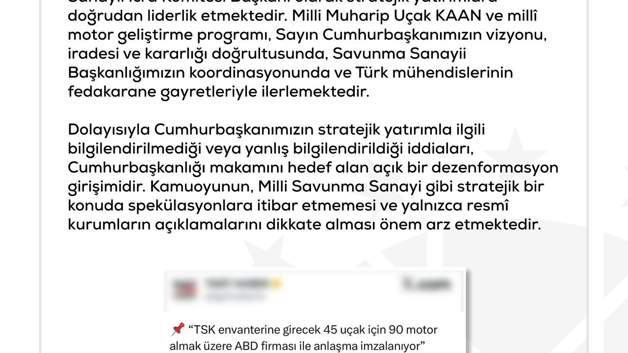 DMM'nin sosyal medya hesabından yapılan açıklamada, "Bazı basın organlarında ve sosyal medyada, 'Cumhurbaşkanı Erdoğan'a KAAN uçaklarının motorları hakkında bilgi verilmediği veya yanlış bilgi verildiği' yönünde dolaşıma sokulan iddialar dezenformasyon ürünüdür. Cumhurbaşkanımız Sayın Recep Tayyip Erdoğan, Savunma Sanayii İcra Komitesi Başkanı olarak stratejik yatırımlara doğrudan liderlik etmektedir. Milli muharip uçak KAAN ve milli motor geliştirme programı, Sayın Cumhurbaşkanımızın vizyonu, iradesi ve kararlılığı doğrultusunda, Savunma Sanayii Başkanlığımızın koordinasyonunda ve Türk mühendislerinin fedakarane gayretleriyle ilerlemektedir. Dolayısıyla Cumhurbaşkanımızın stratejik yatırımla ilgili bilgilendirilmediği veya yanlış bilgilendirildiği iddiaları, Cumhurbaşkanlığı makamını hedef alan açık bir dezenformasyon girişimidir. Kamuoyunun, milli savunma sanayi gibi stratejik bir konuda spekülasyonlara itibar etmemesi ve yalnızca resmi kurumların açıklamalarını dikkate alması önem arz etmektedir” ifadelerine yer verildi. (DHA)