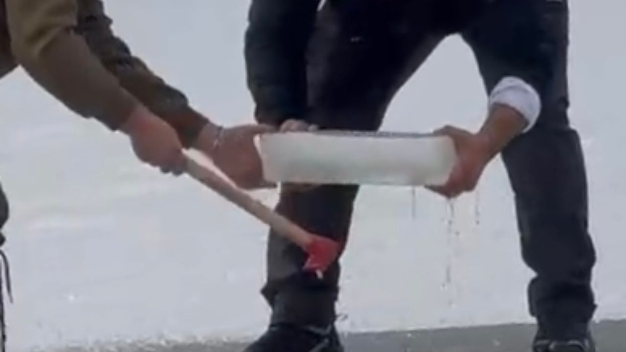 Ayhan ACAR/BARTIN, (DHA)- BARTIN'da, buz tutan Gezen Göleti'nin üzerinde yürüyen gruptan bir kişinin motorlu testereyle buzu kestiği anlar, cep telefonuyla görüntülendi.