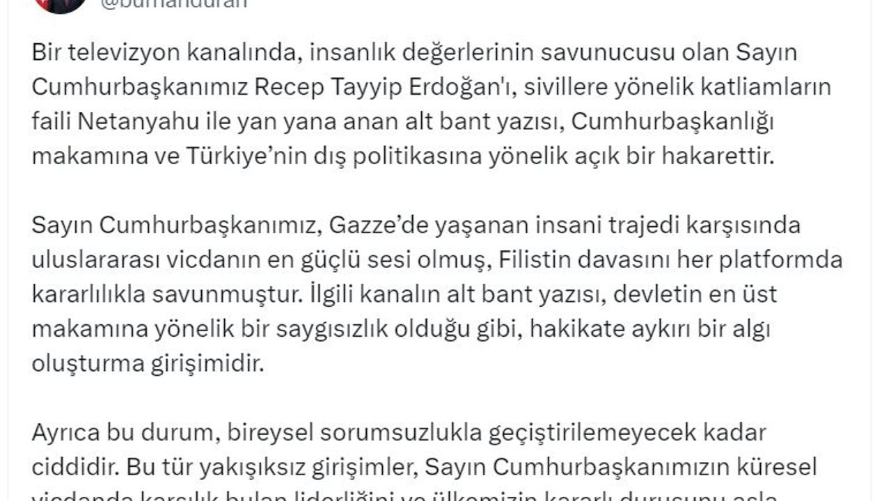 İletişim Başkanı Duran, sosyal medya hesabından yaptığı açıklamada, "Bir televizyon kanalında, insanlık değerlerinin savunucusu olan Sayın Cumhurbaşkanımız Recep Tayyip Erdoğan'ı, sivillere yönelik katliamların faili Netanyahu ile yan yana anan alt bant yazısı, Cumhurbaşkanlığı makamına ve Türkiye’nin dış politikasına yönelik açık bir hakarettir. Sayın Cumhurbaşkanımız, Gazze'de yaşanan insani trajedi karşısında uluslararası vicdanın en güçlü sesi olmuş, Filistin davasını her platformda kararlılıkla savunmuştur. İlgili kanalın alt bant yazısı, devletin en üst makamına yönelik bir saygısızlık olduğu gibi, hakikate aykırı bir algı oluşturma girişimidir. Ayrıca bu durum, bireysel sorumsuzlukla geçiştirilemeyecek kadar ciddidir. Bu tür yakışıksız girişimler, Sayın Cumhurbaşkanımızın küresel vicdanda karşılık bulan liderliğini ve ülkemizin kararlı duruşunu asla gölgeleyemeyecektir" dedi. (DHA)