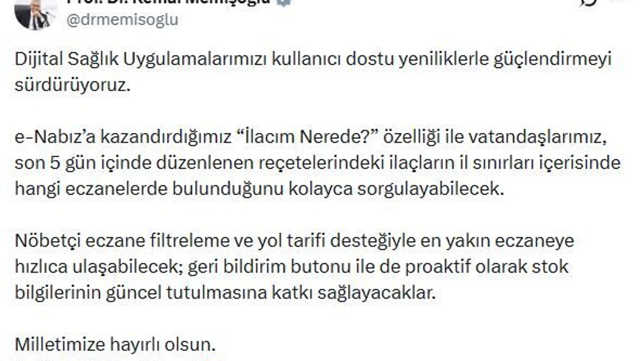 Bakan Memişoğlu, sanal medya hesabından yaptığı paylaşımda, 'Dijital Sağlık Uygulamalarımızı kullanıcı dostu yeniliklerle güçlendirmeyi sürdürüyoruz. e-Nabız'a kazandırdığımız 'İlacım Nerede?' özelliği ile vatandaşlarımız, son 5 gün içinde düzenlenen reçetelerindeki ilaçların il sınırları içerisinde hangi eczanelerde bulunduğunu kolayca sorgulayabilecek. Nöbetçi eczane filtreleme ve yol tarifi desteğiyle en yakın eczaneye hızlıca ulaşabilecek; geri bildirim butonu ile de proaktif olarak stok bilgilerinin güncel tutulmasına katkı sağlayacaklar. Milletimize hayırlı olsun' ifadelerini kullandı.