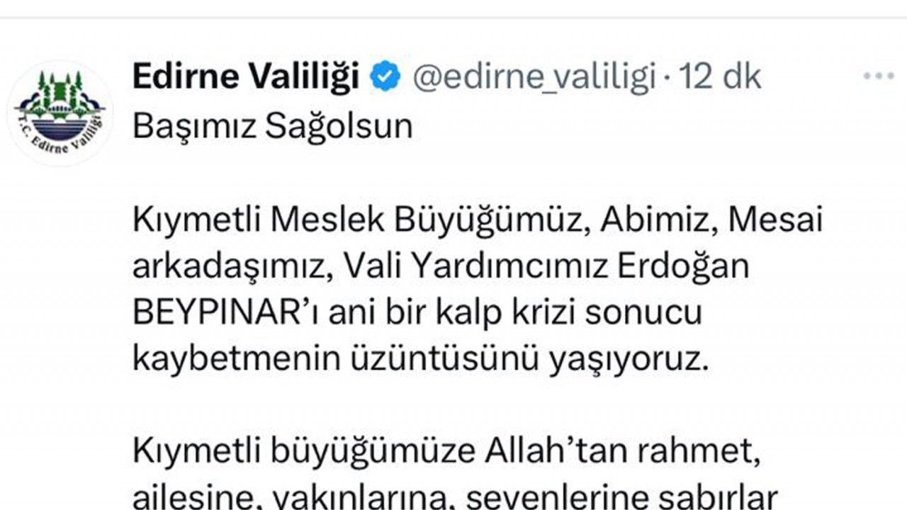 EDİRNE, (DHA)- EDİRNE Vali Yardımcısı Erdoğan Beypınar (59), geçirdiği kalp krizi sonucu hayatını kaybetti.