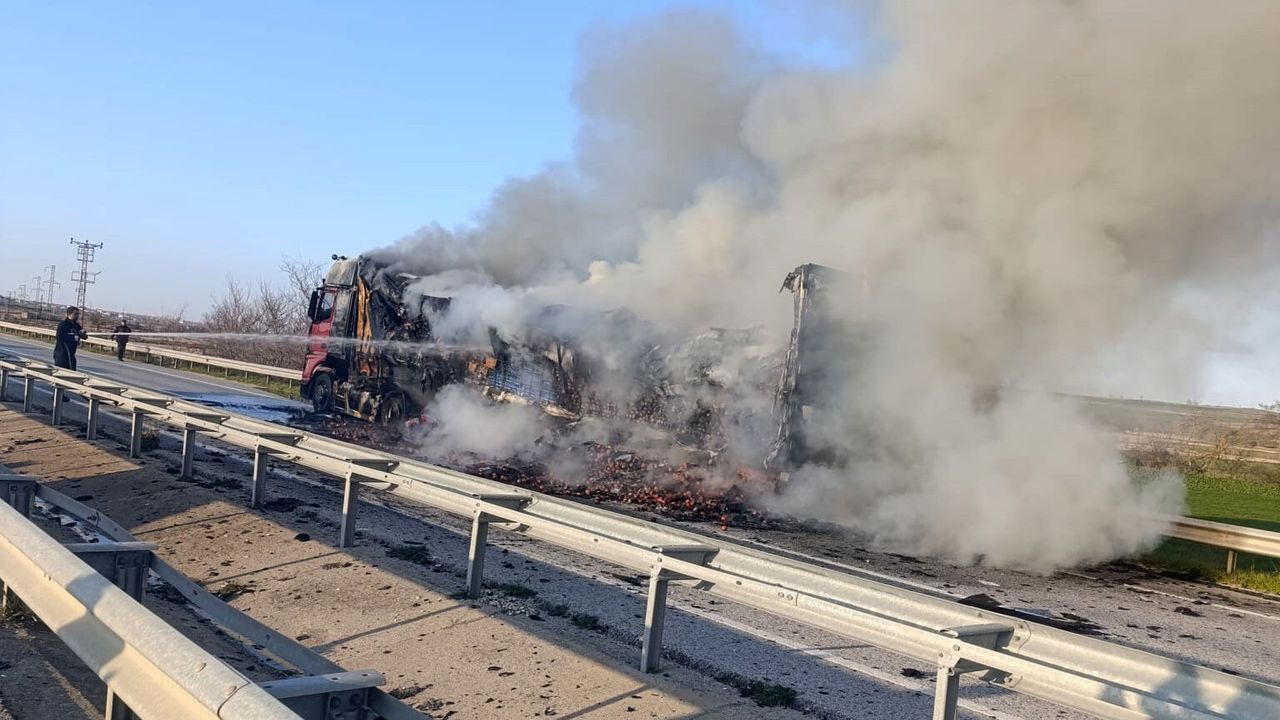Ünsal YÜCEL/EDİRNE,(DHA)-EDİRNE'nin Uzunköprü ilçesinde seyir halindeyken alev alan domates yüklü TIR, yanarak kullanılmaz hale geldi. TIR'ın alev alev yandığı anlar cep telefonu kamerasıyla görüntülendi.