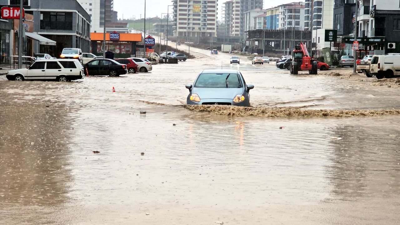 Cumhuriyet Mahallesi Kuvayı Milliye Bulvarı'nda oluşan su birikintileri nedeniyle sürücüler zor anlar yaşadı. Sürücülerin bazıları araçlarıyla caddeye girmeden yollarını değiştirdi, bazıları da risk alıp göle dönen caddeden geçtiklerini belirtti. (DHA)