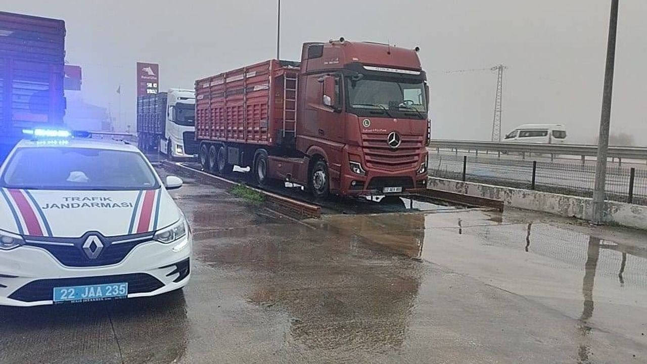 Uzunköprü İlçe Jandarma Komutanlığı Trafik Jandarma Tim Komutanlığı ekipleri, Hamidiye-Harmanlı köy yolunda yaptığı tonaj uygulamasında yük taşıyan araçları denetledi. Denetimde araçların kapasitesi, taşıdığı yük ve sürücülerin belgeleri kontrol edildi. Yük sınırını aştığı belirlenen 2 kamyon sürücüsüne toplam 159 bin 755 lira idari para cezası uygulandı. (DHA)