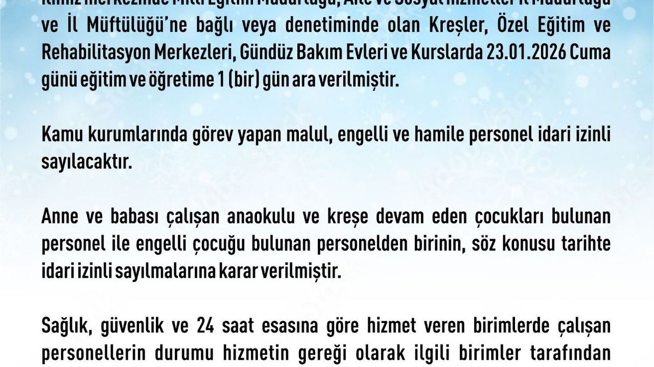 Elazığ Valiliği, kar yağışının gece boyu ve yarın akşama kadar sürmesinin beklendiği belirtilerek kent merkezinde Milli Eğitim Müdürlüğü, Aile ve Sosyal Hizmetler İl Müdürlüğü ile İl Müftülüğü'ne bağlı veya denetimindeki kreşler, özel eğitim ve rehabilitasyon merkezleri, gündüz bakım evleri ve kurslarda eğitim ve öğretime bir gün ara verildiği bildirdii. Valilik'ten yapılan açıklamada, 'Kar yağışının gece boyu ve yarın akşama kadar süreceği değerlendirildiğinden ilimiz merkezinde Milli Eğitim Müdürlüğü, Aile ve Sosyal Hizmetler İl Müdürlüğü ve İl Müftülüğü'ne bağlı veya denetiminde olan kreşler, özel eğitim ve rehabilitasyon merkezleri, gündüz bakım evleri ve kurslarda 23 Ocak 2026 Cuma günü eğitim ve öğretime 1 gün ara verilmiştir. Kamu kurumlarında görev yapan malul, engelli ve hamile personel idari izinli sayılacaktır. Anne ve babası çalışan anaokulu ve kreşe devam eden çocukları bulunan personel ile engelli çocuğu bulunan personelden birinin, söz konusu tarihte idari izinli sayılmalarına karar verilmiştir. Sağlık, güvenlik ve 24 saat esasına göre hizmet veren birimlerde çalışan personellerin durumu hizmetin gereği olarak ilgili birimler tarafından değerlendirilecektir. İlçelerimizde ilçe şartlarına göre kaymakamlarca karar verilecektir' denildi. (DHA)