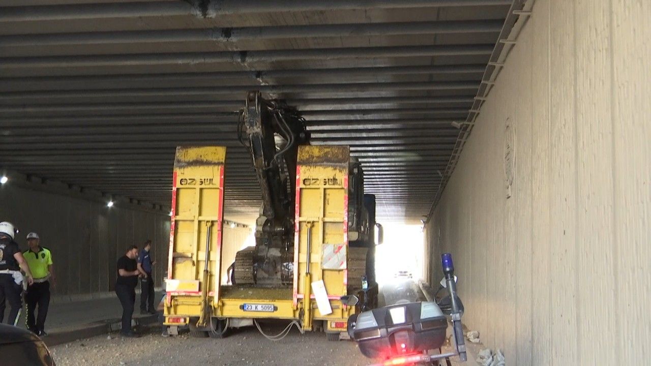 Tekin YALÇINKAYA/ ELAZIĞ, (DHA)- ELAZIĞ’da, TIR, taşıdığı iş makinesi ile alt geçitte sıkıştı. 1,5 saatlik çalışmanın ardından TIR ve iş makinesinin lastikleri indirilerek sıkıştıkları alt geçitten kurtarıldı.