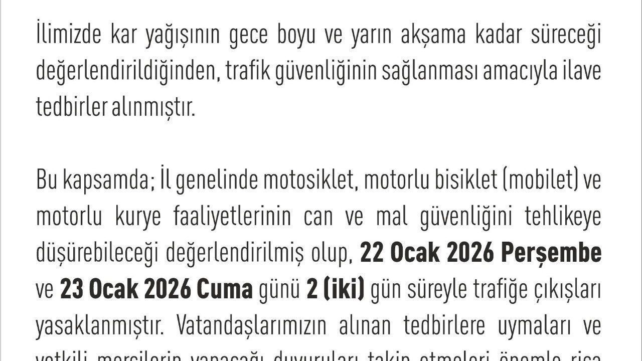 Valilikten yapılan açıklamada, kentte kar yağışının gece boyu ve yarın akşama kadar sürmesinin beklendiği, trafik güvenliğinin sağlanması amacıyla ilave tedbirlerin alındığı belirtildi. Açıklamada; kent genelinde motosiklet, motorlu bisiklet ve motokurye faaliyetlerinin olumsuz hava koşullarında can ve mal güvenliğini tehlikeye düşürebileceği değerlendirilerek, 22 Ocak Perşembe ile 23 Ocak Cuma günü 2 gün süreyle araçların trafiğe çıkışlarının yasaklandığı belirtildi. (DHA)