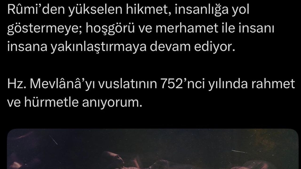 ANKARA, (DHA)- CUMHURBAŞKANI Recep Tayyip Erdoğan'ın eşi Emine Erdoğan, "Hz. Mevlana'yı, vuslatının 752'nci yılında rahmet ve hürmetle anıyorum" dedi.