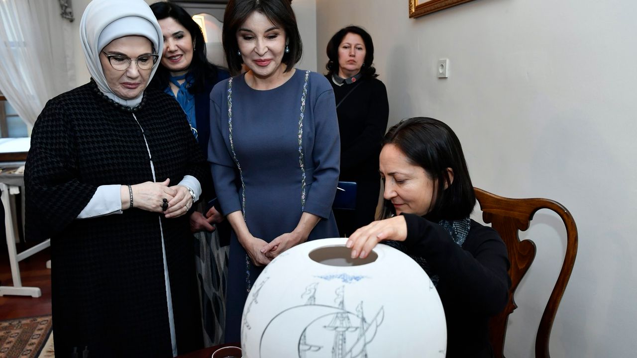 Cumhurbaşkanı Recep Tayyip Erdoğan'ın eşi Emine Erdoğan, Özbekistan Cumhurbaşkanı Şevket Mirziyoyev'in eşi Ziroat Mirziyoyeva ile Ankara Palas'ta bir araya geldi. Emine Erdoğan, Ankara Palas'ın girişinde karşıladığı Mirziyoyeva ile Hereke dokumaları, yıldız porselenleri ve diplomatik hediyelerin de aralarında olduğu Osmanlı ve Cumhuriyet dönemine ait seçkin eserlerden oluşan müzeyi gezdi. Milli Saraylar İdaresi Başkanı Yasin Yıldız, müzedeki eserleri yakından inceleyen lider eşlerine bilgi verdi. Özellikle Anadolu nakış tekniklerini çok beğendiğini ifade eden Mirziyoyeva, ülkesinde de bu teknikle ürünler üretilmesini çok istediğini belirtti. Özbek halkının bu tür sanatlara ilgisi olduğunu kaydeden Mirziyoyeva, Türkiye'nin bu konuda kendilerine destek vermesini memnuniyetle karşılayacağını söyledi. Lider eşleri Ankara Palas'ta, olgunlaşma enstitülerinde üretilen kitre bebek, çini ve seramik ürünler ile Türk işi, sırma, hesap işi ve beyaz iş gibi nakış teknikleriyle hazırlanan ürünlerin sergilendiği bölümü de ziyaret ederek, çalışmalar hakkında bilgi aldı.
