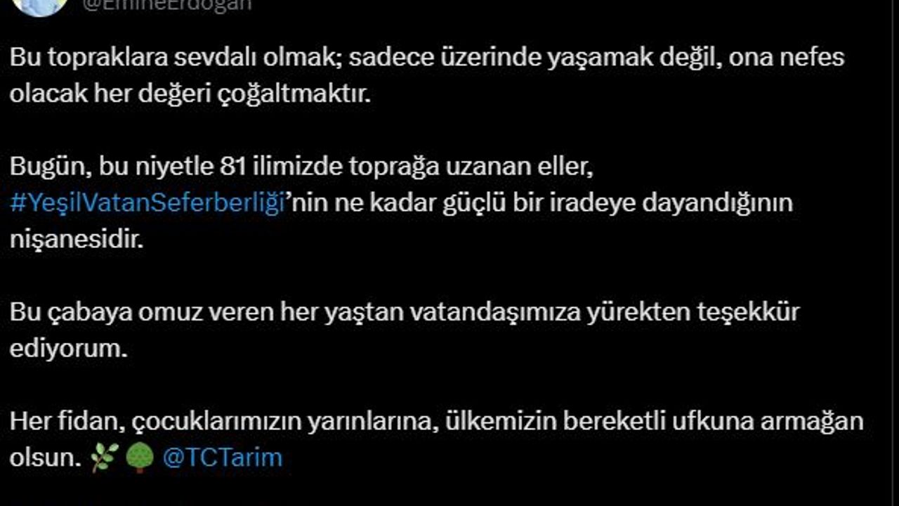 Emine Erdoğan, sosyal medya hesabından yaptığı paylaşımda, "Bu topraklara sevdalı olmak; sadece üzerinde yaşamak değil, ona nefes olacak her değeri çoğaltmaktır. Bugün, bu niyetle 81 ilimizde toprağa uzanan eller, 'Yeşil Vatan Seferberliği'nin ne kadar güçlü bir iradeye dayandığının nişanesidir. Bu çabaya omuz veren her yaştan vatandaşımıza yürekten teşekkür ediyorum. Her fidan, çocuklarımızın yarınlarına, ülkemizin bereketli ufkuna armağan olsun" dedi. (DHA)