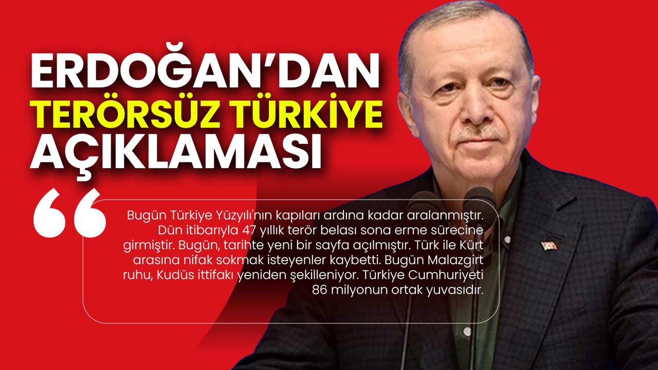 “Dün itibarıyla 47 yıllık terör belası sona erme sürecine girmiştir” diyen Erdoğan, Türkiye'nin artık gözyaşlarıyla dolu bir dönemi kapattığını ve yeni bir sayfa açtığını vurguladı.