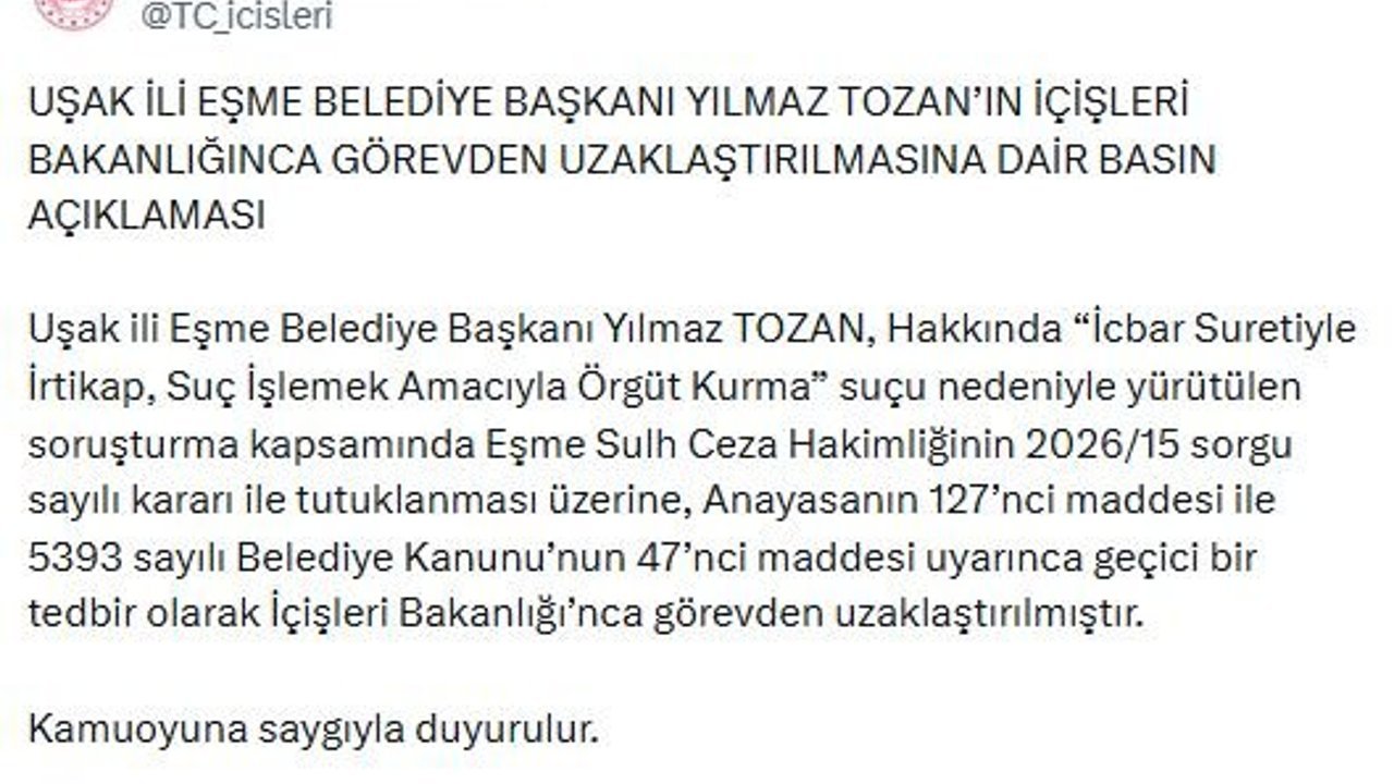 Bakanlığın sanal medya hesabından yapılan açıklamada, 'Uşak ili Eşme Belediye Başkanı Yılmaz Tozan, hakkında 'İcbar Suretiyle İrtikap', 'Suç İşlemek Amacıyla Örgüt Kurma' suçu nedeniyle yürütülen soruşturma kapsamında Eşme Sulh Ceza Hakimliğinin 2026/15 sorgu sayılı kararı ile tutuklanması üzerine, Anayasa'nın 127'nci maddesi ile 5393 sayılı Belediye Kanunu'nun 47'nci maddesi uyarınca geçici bir tedbir olarak İçişleri Bakanlığı'nca görevden uzaklaştırılmıştır' denildi. (DHA)