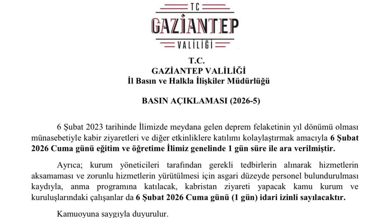 Gaziantep Valiliği tarafından yapılan açıklamada kabir ziyaretleri ve diğer etkinlikler gereği 1 gün eğitim ve öğretime ara verildiği ifade edilerek, '6 Şubat 2023 tarihinde ilimizde meydana gelen deprem felaketinin yıl dönümü olması münasebetiyle kabir ziyareti ve diğer etkinliklere katılımı kolaylaştırmak amacıyla 6 Şubat 2016 Cuma günü eğitim ve öğretime ilimiz genelinde 1 gün süre ile ara verilmiştir. Ayrıca; kurum yöneticileri tarafından gerekli tedbirlerin alınarak hizmetlerin aksamaması ve zorunlu hizmetlerin yürütülmesi için asgari düzeyde personel bulundurulması kaydıyla, anma programına katılacak, kabristan ziyareti yapacak kamu kurum ve kuruluşlardaki çalışanlar da 6 Şubat 2016 Cuma günü 1 gün idari izinli sayılacaktır' denildi. (DHA)