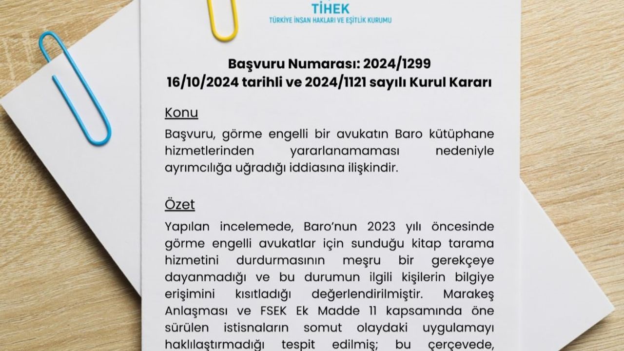 Görme engelli Avukat Olgun Yılmaz, Ankara 1 No'lu Barosu'na ait kütüphaneden, görme engelliler için sunulan kitap tarama ve okuma hizmetinin 2023 yılında durdurulması nedeniyle yararlanamayınca TİHEK'e başvuruda bulundu. Yılmaz, kütüphanede ayrımcılık yapıldığını belirterek, ihlalin giderilmesini talep etti. TİHEK, baronun bu hizmeti durdurmasının meşru bir gerekçeye dayanmadığından kişilerin bilgiye ulaşımının kısıtlandığını değerlendirdi. Baronun ayrımcılık yasağını ihlal etmediğini kanıtlayamadığı ve bu nedenle ayrımcılık yasağının ihlal edildiği kanaatine varıldı. Baroya, 6701 Sayılı Türkiye İnsan Hakları ve Eşitlik Kurumu Kanunu'nda yer alan ayrımcılık yasağını ihlal ettiği gerekçesiyle en üst sınırdan 141 bin 934 TL idari para cezası uygulanmasına karar verildi.