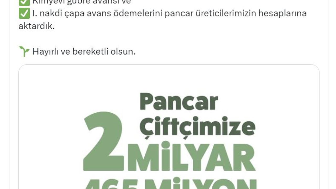 ANKARA, (DHA)- TARIM ve Orman Bakanı İbrahim Yumaklı, Türkşeker aracılığıyla toplamda 2 milyar 465 milyon TL olmak üzere; kimyevi gübre avansı ve 1'inci nakdi çapa avans ödemelerinin pancar üreticilerinin hesaplarına aktarıldığını duyurdu.