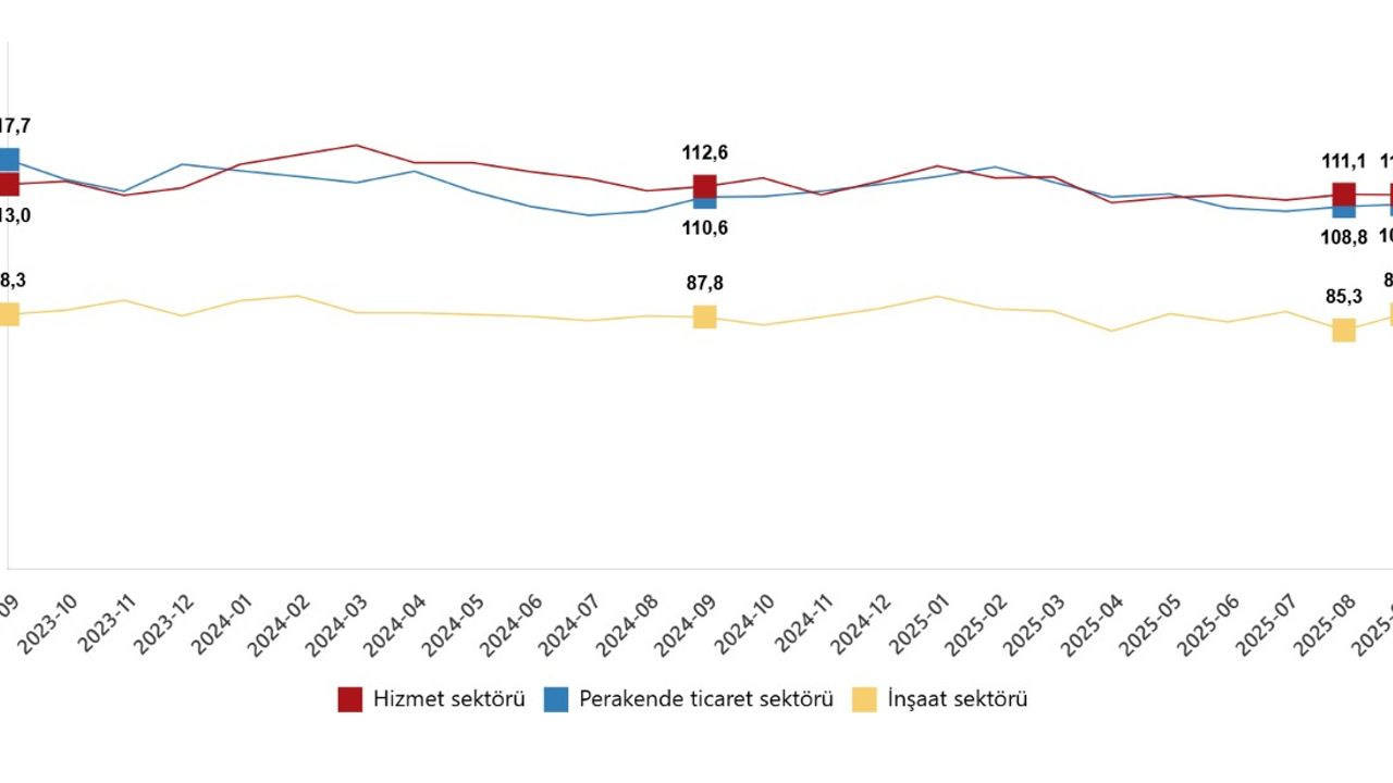 TÜİK, Eylül 2025 dönemine ilişkin hizmet, perakende ticaret ve inşaat güven endekslerini açıkladı. Buna göre; güven endeksi eylül ayında bir önceki aya göre hizmet sektöründe 0,1 azalarak 111 değerini, perakende ticaret sektöründe yüzde 0,4 oranında artarak 109,2 değerini ve inşaat sektöründe yüzde 3,6 oranında artarak 88,3 değerini aldı. (DHA)