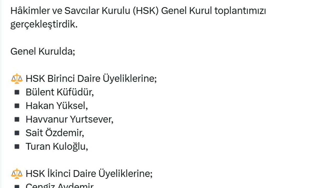 Bakan Tunç, sosyal medya hesabından yaptığı açıklamada, HSK Genel Kurul toplantısını gerçekleştirdiklerini belirterek, "Genel Kurulda; HSK Birinci Daire Üyeliklerine Bülent Küfüdür, Hakan Yüksel, Havvanur Yurtsever, Sait Özdemir, Turan Kuloğlu, HSK İkinci Daire Üyeliklerine Cengiz Aydemir, Alişan Tiryaki, Çetin Arslan, Fuzuli Aydoğdu, Serdar Ateş, Seyfi Han seçilmiştir. HSK Birinci Daire Başkanlığına Turan Kuloğlu, HSK İkinci Daire Başkanlığına ve HSK Başkan Vekilliğine Fuzuli Aydoğdu seçilmiştir. HSK daire başkanlarımıza ve üyelerimize görevlerinde üstün muvaffakiyetler diliyorum. Yargı teşkilatımız, ülkemiz ve milletimiz için hayırlara vesile olmasını temenni ediyorum" dedi. (DHA)