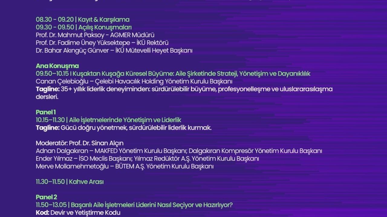 Kongrenin açılış konuşmaları AGMER Müdürü Prof. Dr. Mahmut Paksoy, İstanbul Kültür Üniversitesi Rektörü Prof. Dr. Fadime Üney Yüksektepe ve İKÜ Mütevelli Heyet Başkanı Dr. Bahar Akıngüç Günver tarafından gerçekleştirilecek. Programın ana konuşmasını ise Çelebi Havacılık Holding Yönetim Kurulu Başkanı Canan Çelebioğlu yapacak. Çelebioğlu, 35 yılı aşkın liderlik deneyiminden hareketle aile şirketlerinde sürdürülebilir büyüme, profesyonelleşme ve uluslararasılaşma konularını ele alacak.