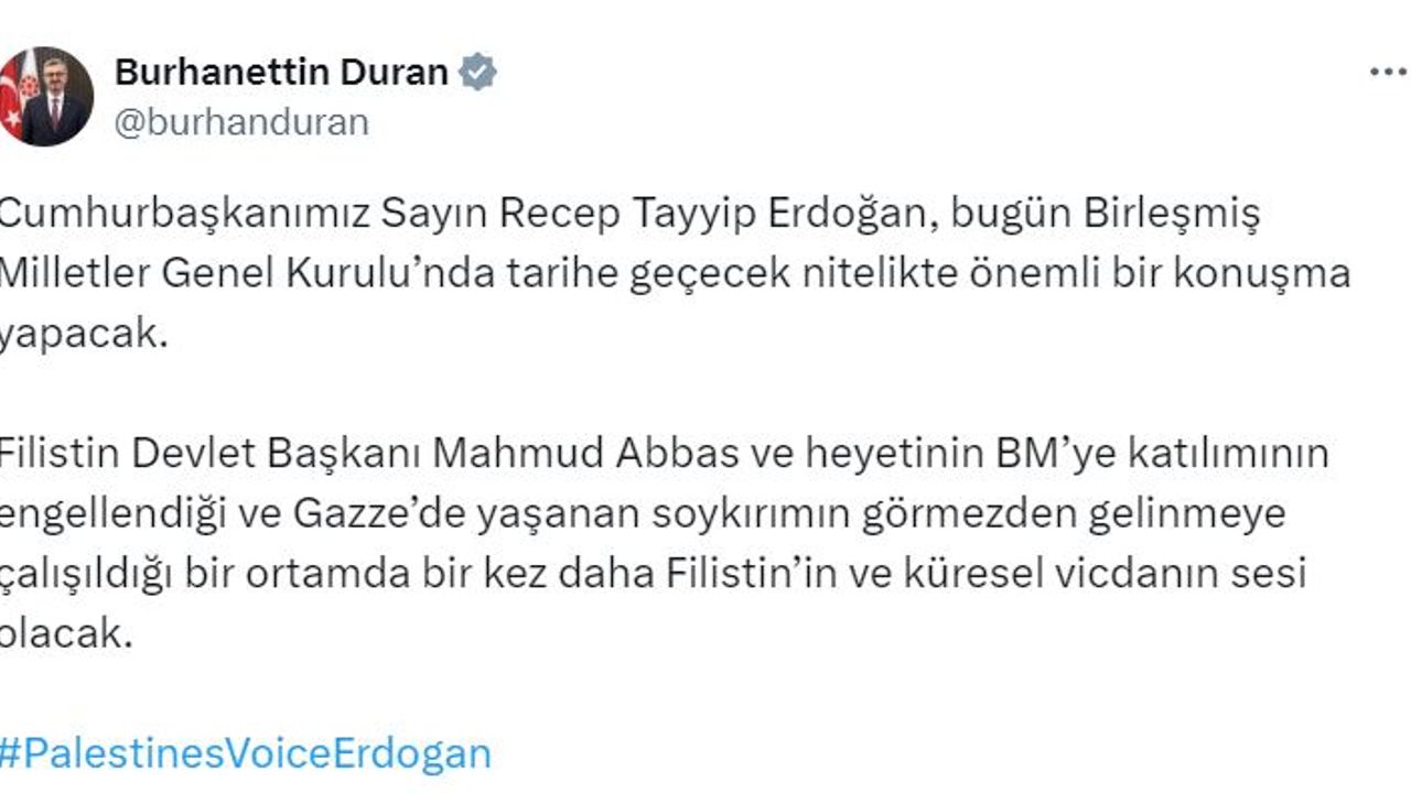 İletişim Başkanı Duran, sosyal medya hesabından yaptığı açıklamada, "Cumhurbaşkanımız Sayın Recep Tayyip Erdoğan, bugün Birleşmiş Milletler Genel Kurulu’nda tarihe geçecek nitelikte önemli bir konuşma yapacak. Filistin Devlet Başkanı Mahmud Abbas ve heyetinin BM’ye katılımının engellendiği ve Gazze’de yaşanan soykırımın görmezden gelinmeye çalışıldığı bir ortamda bir kez daha Filistin’in ve küresel vicdanın sesi olacak" ifadelerini kullandı. (DHA)