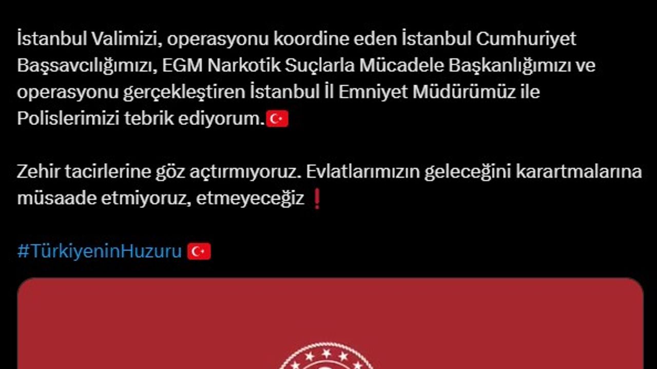 İSTANBUL,(DHA) - İÇİŞLERİ Bakanı Ali Yerlikaya, sosyal medya hesabında yaptığı paylaşımda İstanbul polisinin yaptığı operasyonlarda 75 kilogram skunk isimli uyuşturucu madde ele geçirildiğini ve 2 şüphelinin gözaltına alındığını duyurdu.